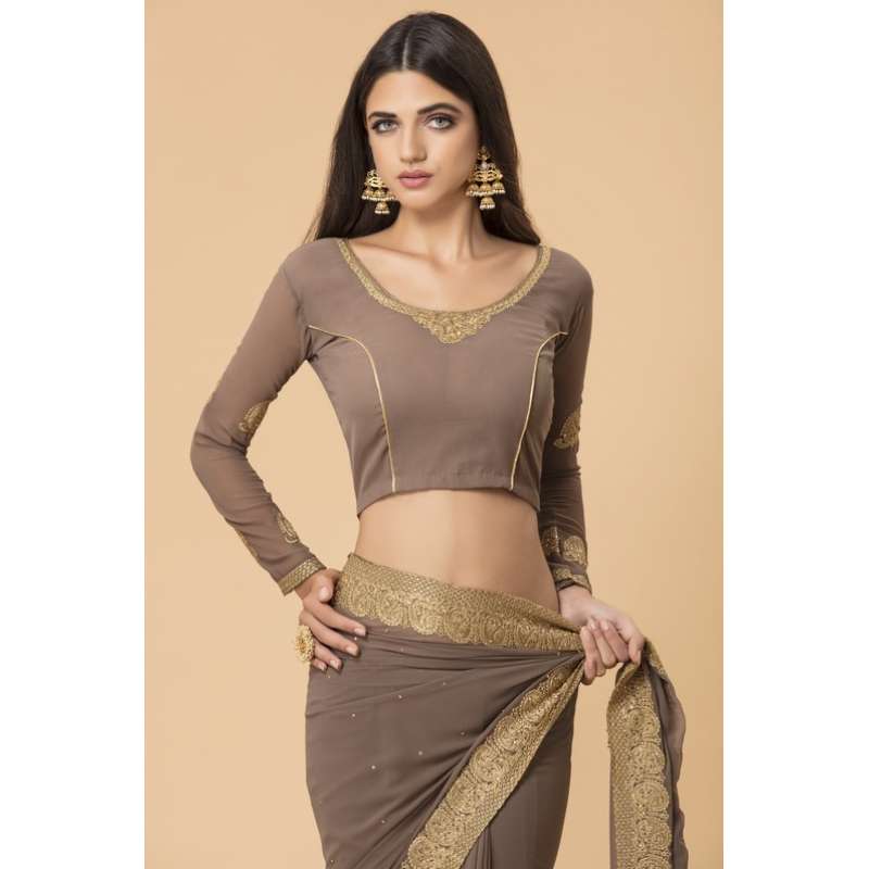 - It is paired with a georgette blouse with antique threadwork done on the neckline