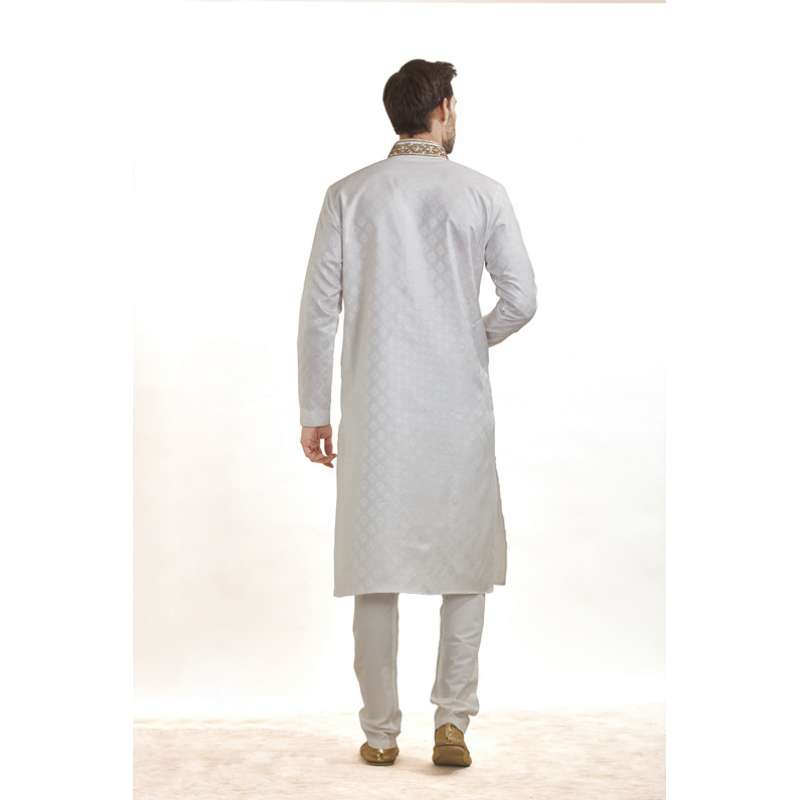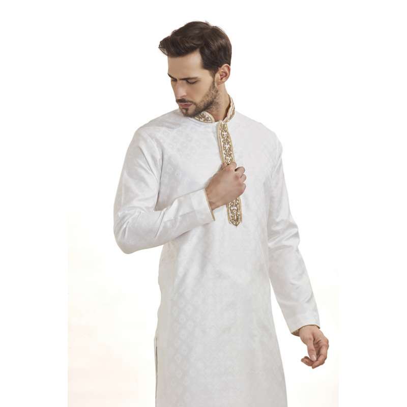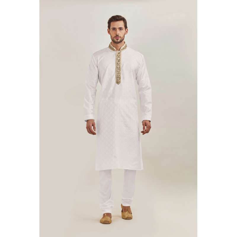 • White self print kurta pyjama with gold thread detailing on the neckline