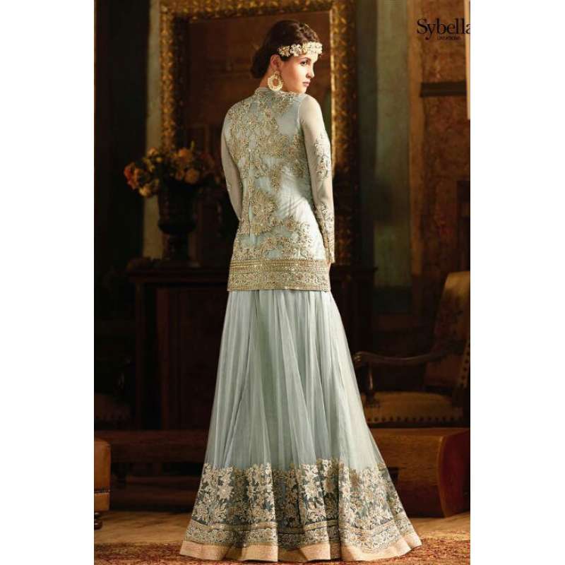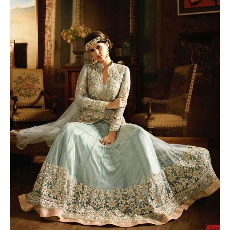Inspire with the rich heritage of Indian aesthetics! Embrace yourself with this sea blue sybella lehenga dress. Net top, heavy japan satin inner, santoon bottom and nazmin chiffon dupatta.