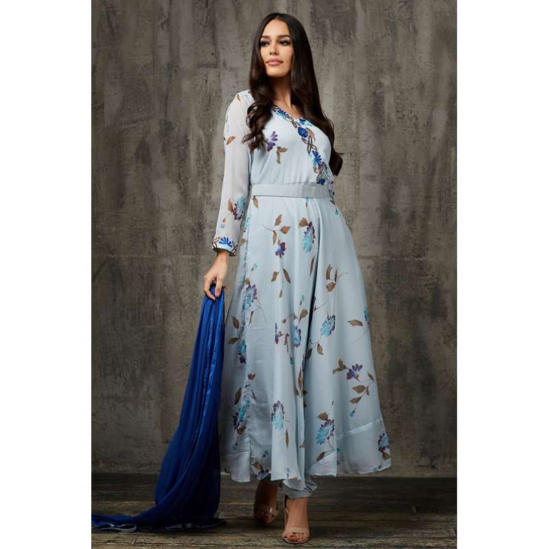 Sky Blue Floral Printed Frock Ready to Wear Pakistani Dress