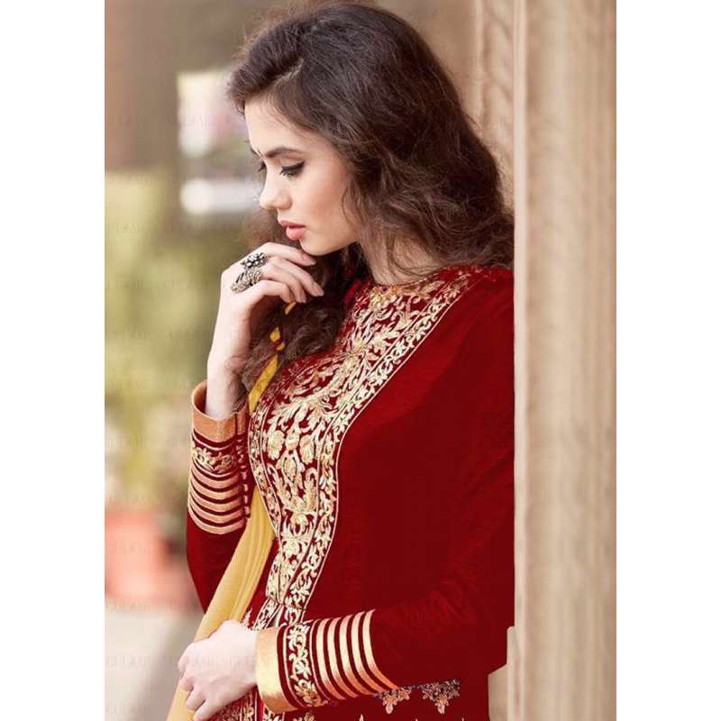 Fall into fashion with this beautiful red anarkali suit designed with embroidery and with patch border work. Comes with semi-stitched top, bottom and dupatta fabric. The top can be customized to fit sizes 34” to 42” inch bust.