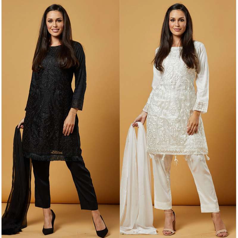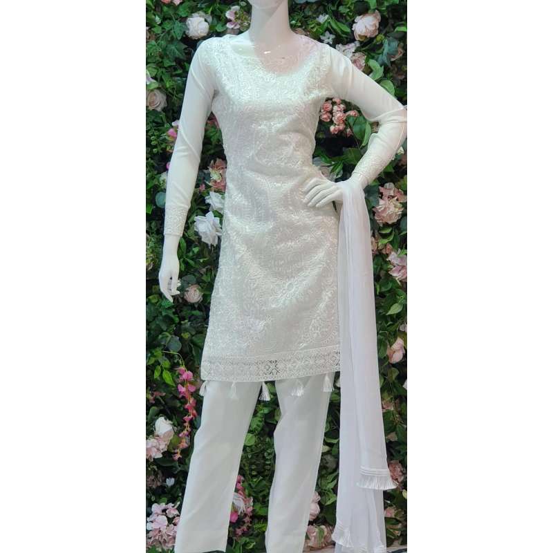 Bottoms soft viscose in same colour as top. Premium chiffon plain dupatta with self colour fringe lace all over.