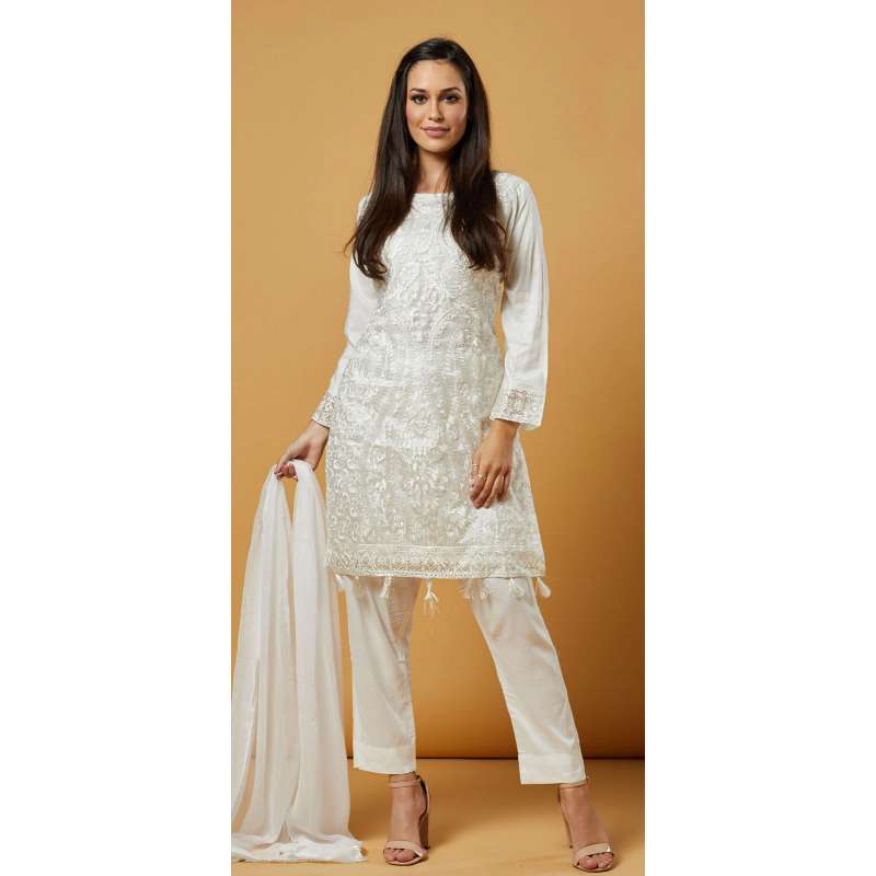 Readymade pakistani organza with self colour embroided suit front. Back & sleeves in premium linen. Self colour wrist embroidery insertion. Wrist. Fancy single thread latkans on daman.