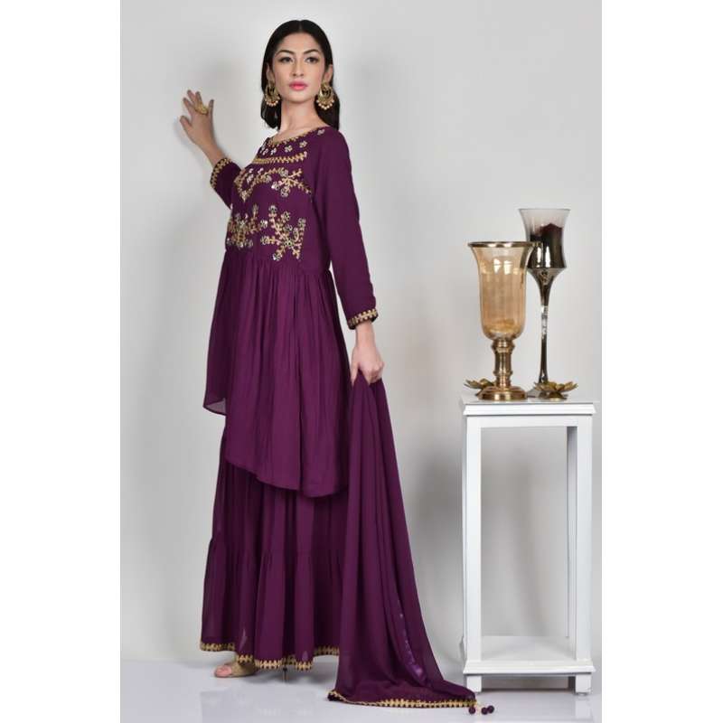 Tags: purple gharara, eid salwar kameez, indian dress, designer dress, ready made salwar kameez in Uk, ready made Pakistani suit, georgette suit, ethnic gharara, ready to wear gharara,