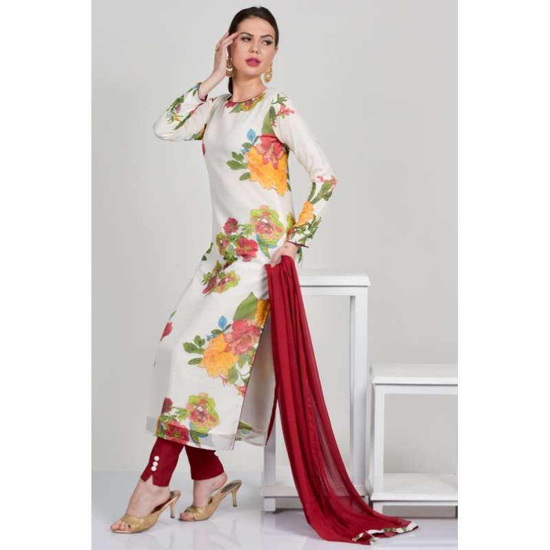 Gorgeous cream color printed kurti with contrast piping on sleeves, neckline and slits. It is paired with contrast color dupatta with 2 side printed border and matching pencil trousers with cream bottons.