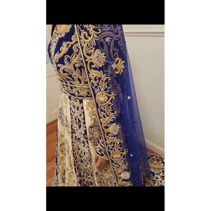 A gorgeous heavy embroided royal blue and gold gown with a relatively long trail,