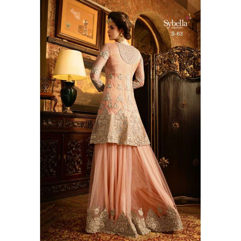 with the rich heritage of Indian aesthetics! Embrace yourself with this peach sybella lehenga dress. Net top, heavy japan satin inner, santoon bottom and nazmin