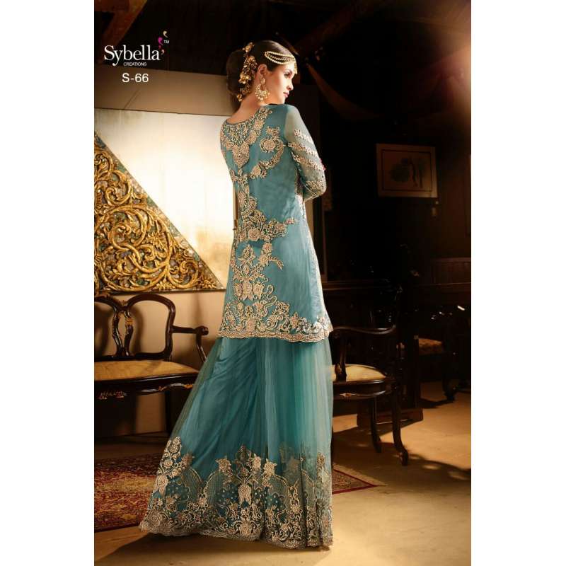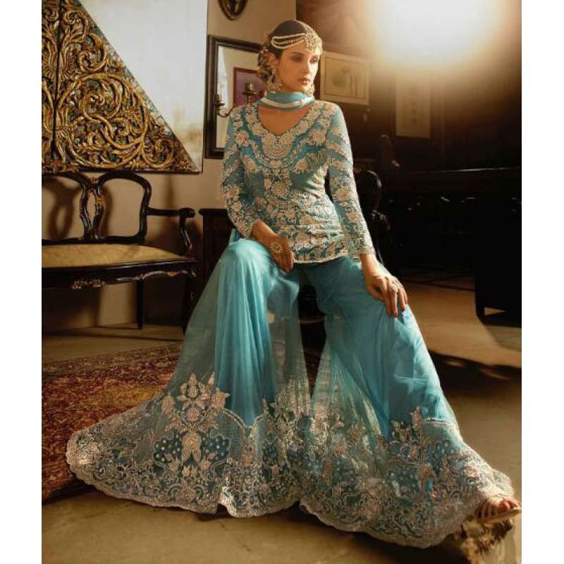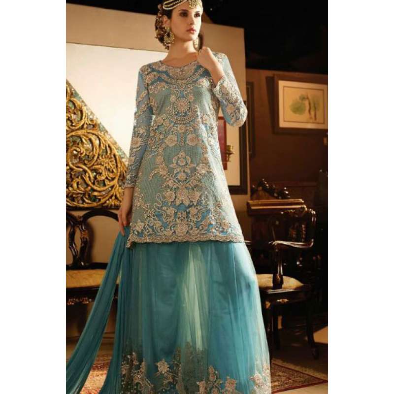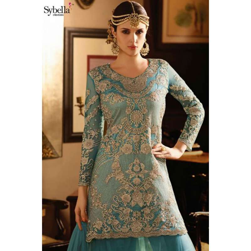 with the rich heritage of Indian aesthetics! Embrace yourself withthis blue sybella dress. Net top, heavy japan satin inner, santoon bottom and nazmin